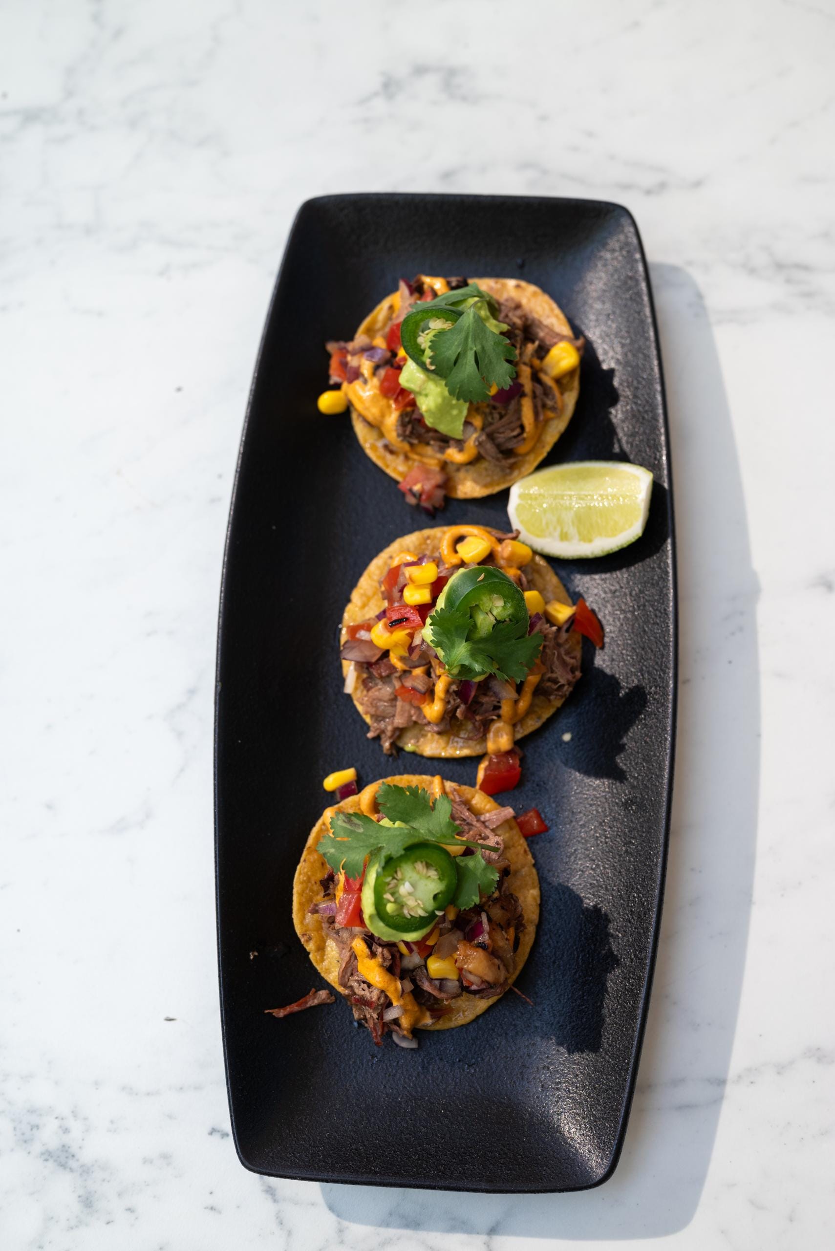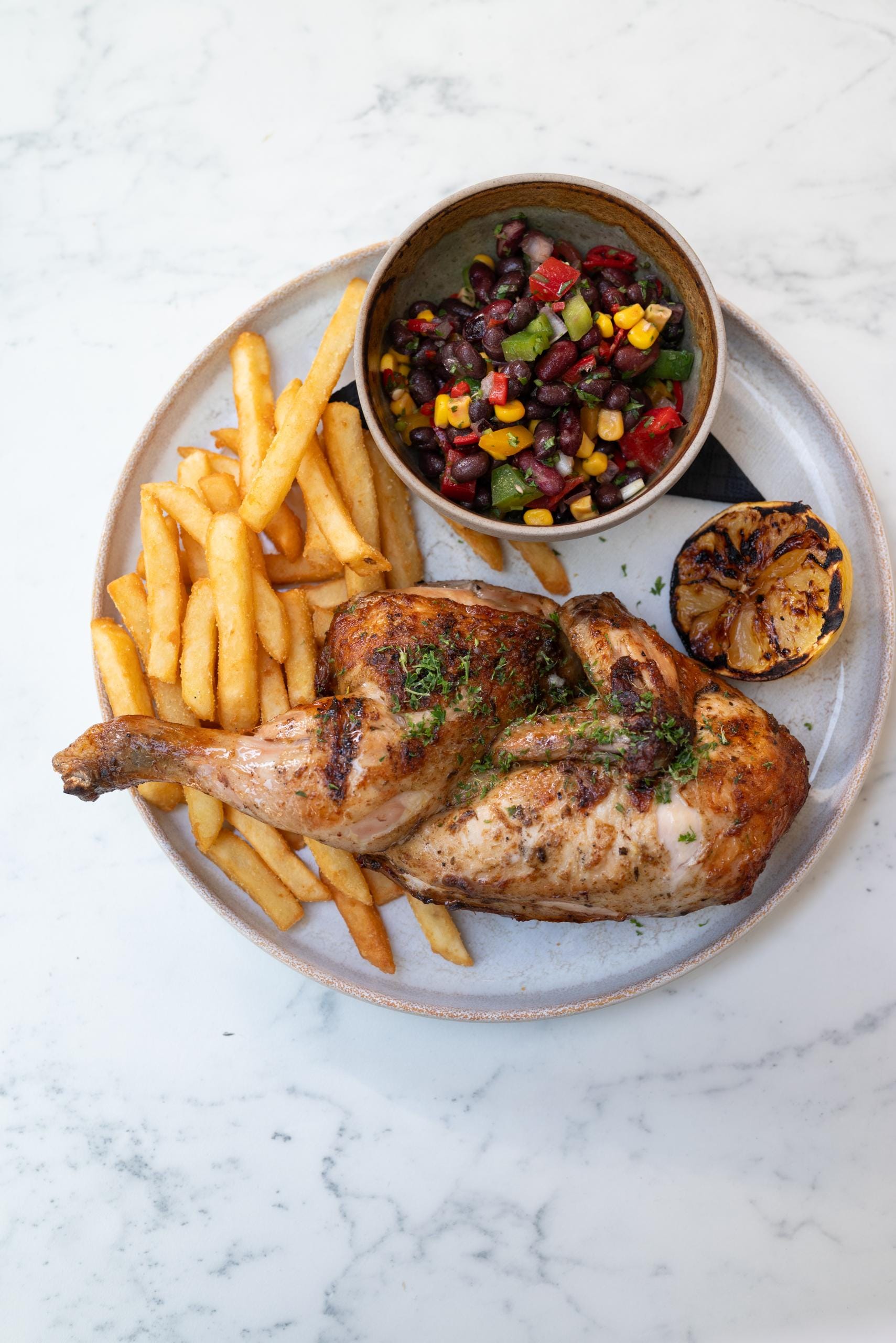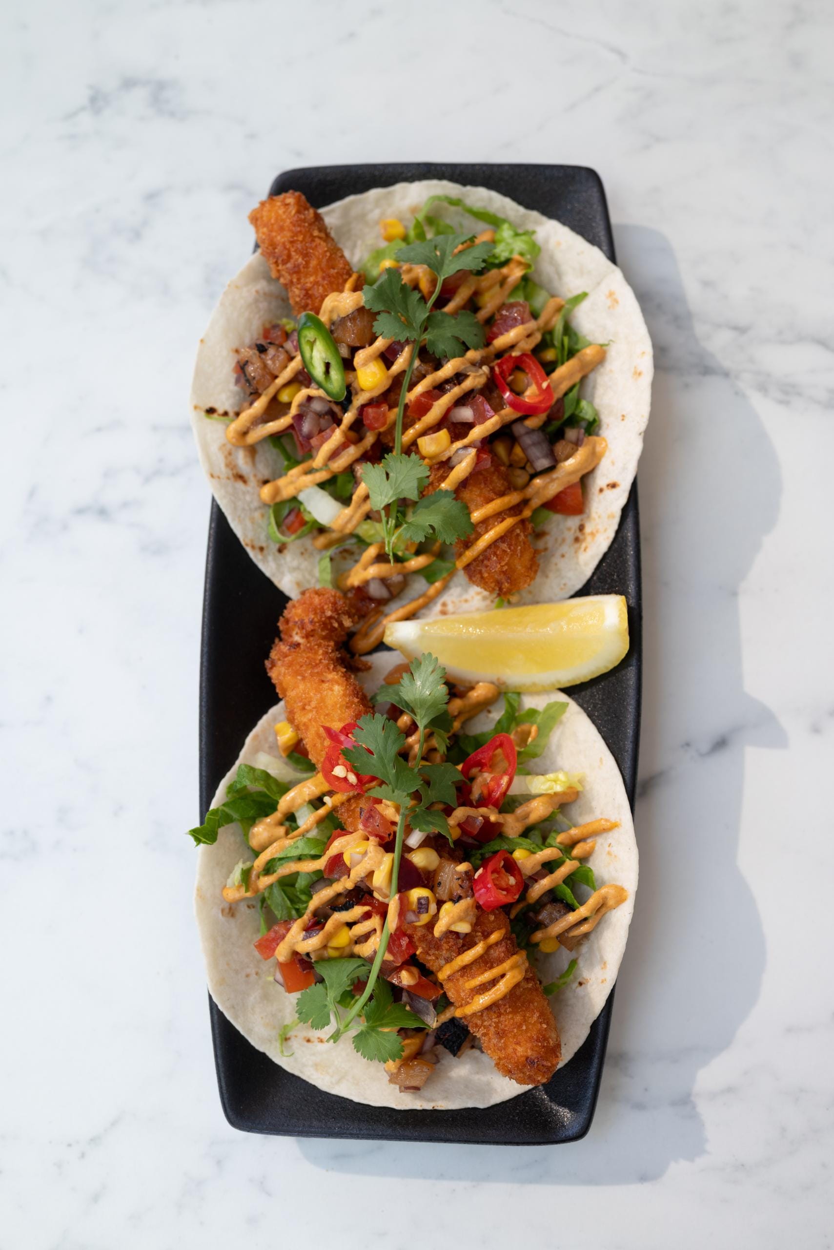 Panko crumbed snapper, charred pineapple & corn Pico de Gallo,