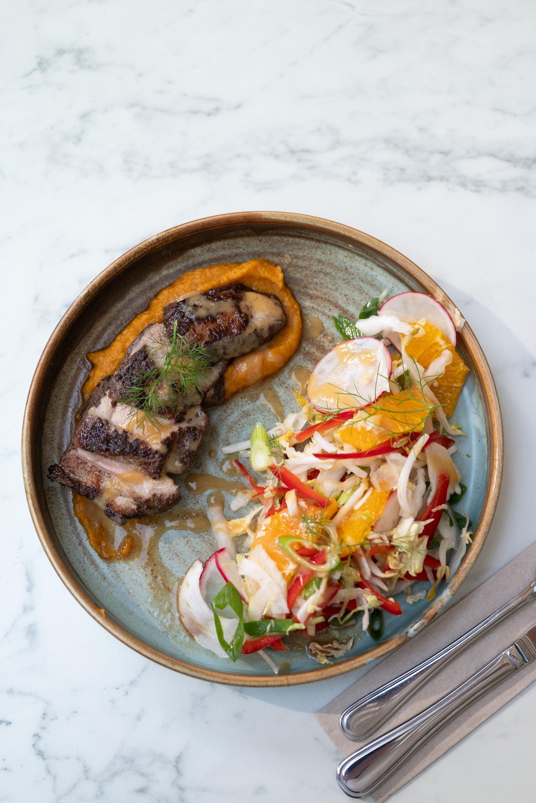 Marinated sirloin steak, rice noodles, slaw, cucumber, bean shoots, mint, coriander, crispy shallots, sesame seeds & nam jim dressing