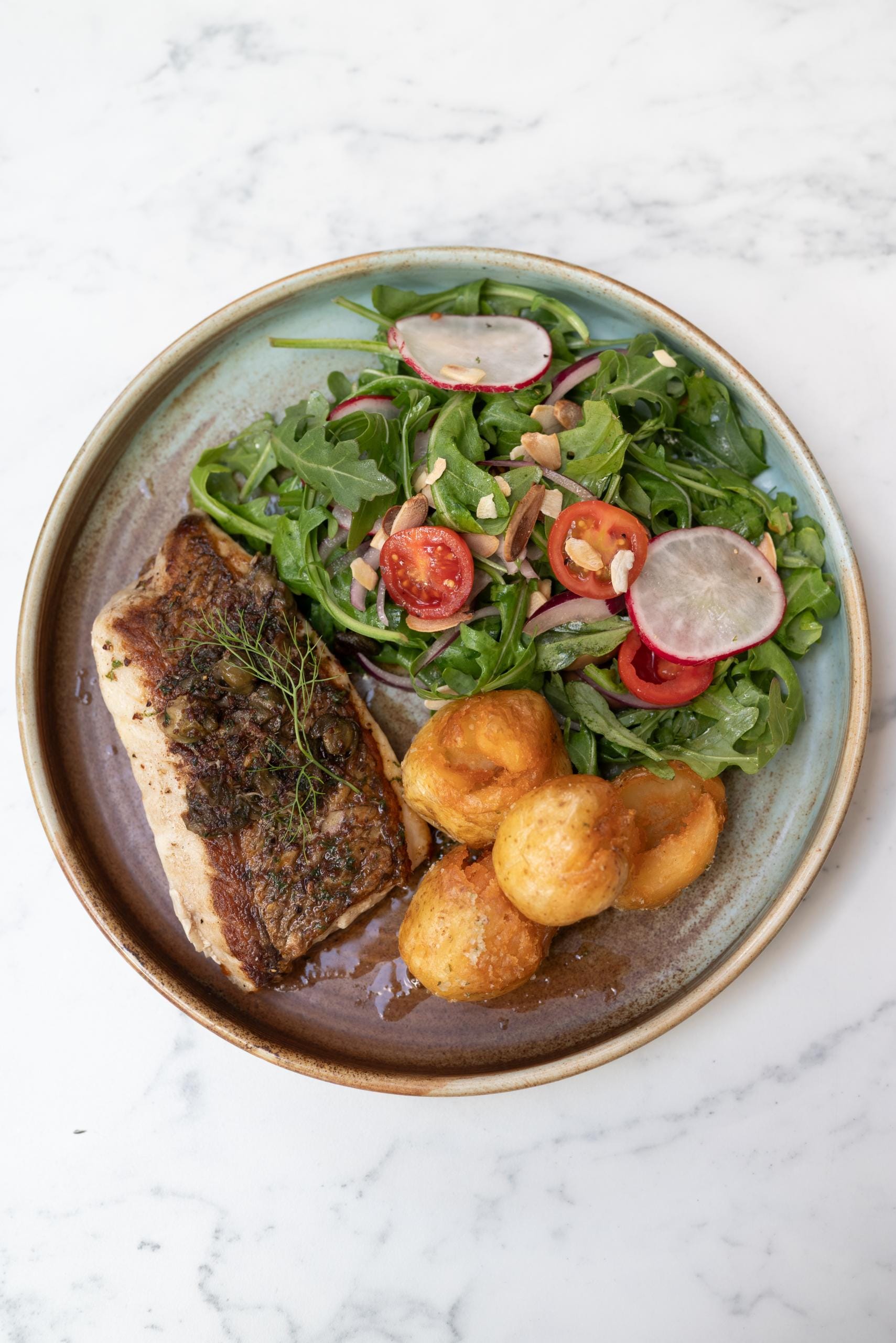 Fresh WA crispy skin snapper, caper butter sauce, crushed