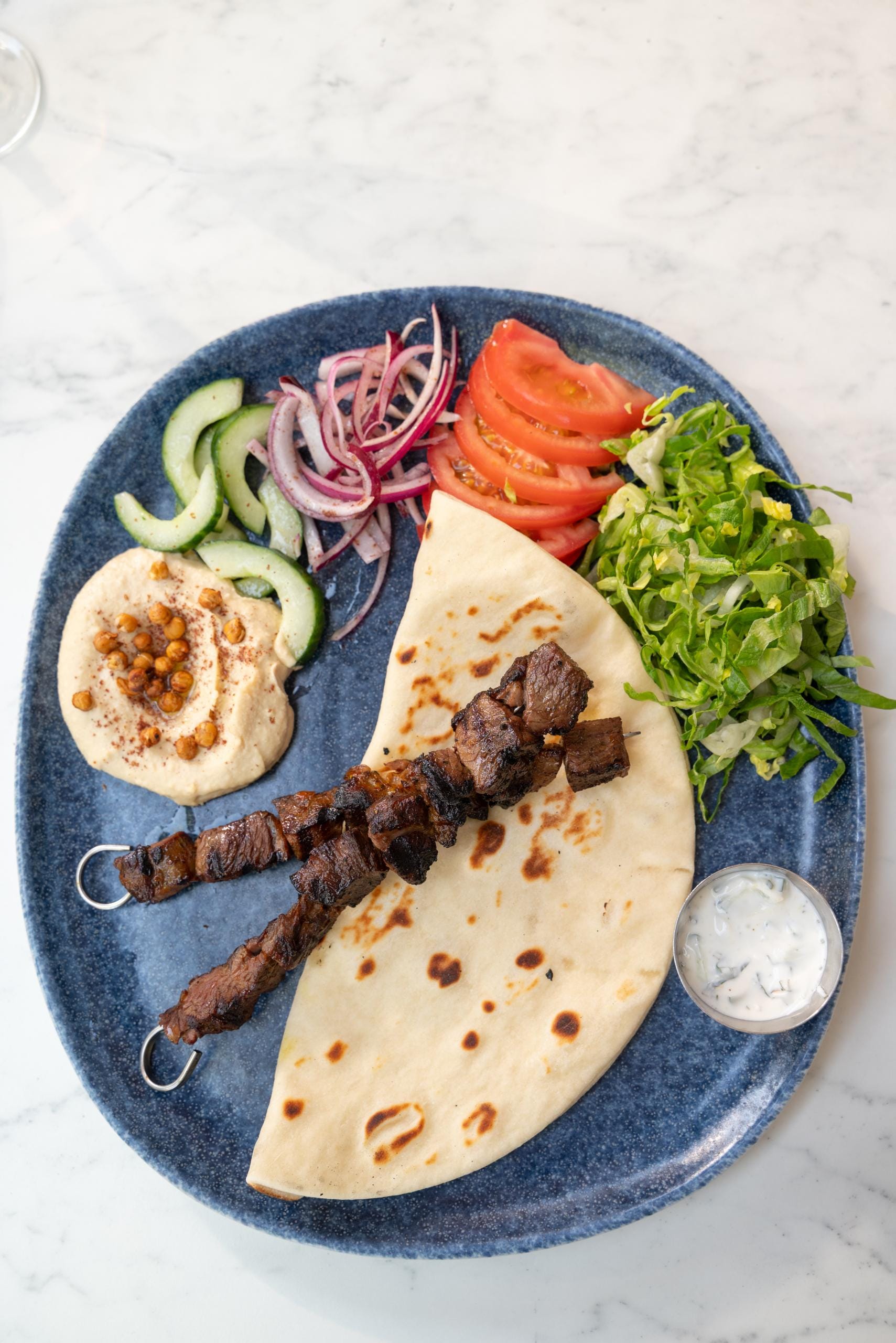 Marinated chargrilled lamb rump, flat bread, hummus, tzatziki, cos lettuce, tomato, red onion & cucumber